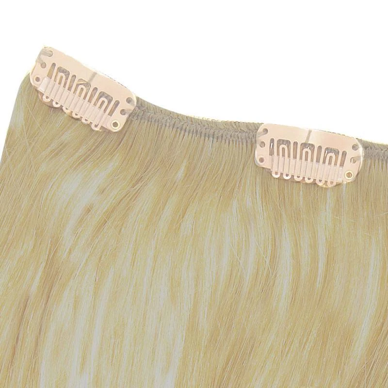 Des cheveux 100% naturels de couleur Blonde Platine. Le paquet contient une bande de 26 cm et une bande de 22 cm de large à clips. Rapide et simple d’utilisation.
