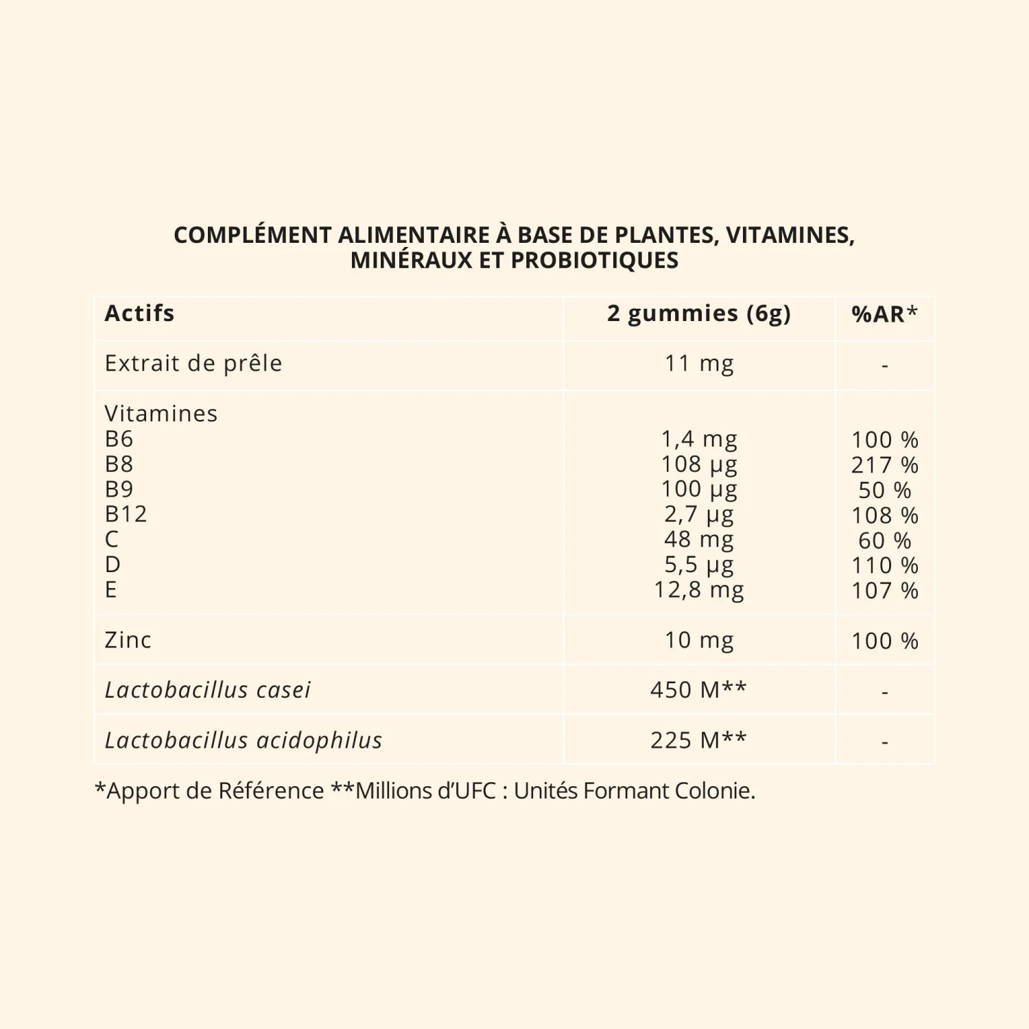 Faites confiance à Hair et Nails, des gummies formulés par des experts en médecine, en ingénierie et en pharmacie. Leur efficacité et leur sécurité sont prouvées, et ils intègrent les dernières avancées scientifiques, notamment en exploitant les bienfaits capillaires des probiotiques. De plus, ces gummies contiennent des actifs premium, comme l’extrait hautement concentré et qualitatif de prêle titré à 7% de silice. Grâce à leur phase de mâchage, ils assurent une assimilation rapide et une biodisponibilité optimale.