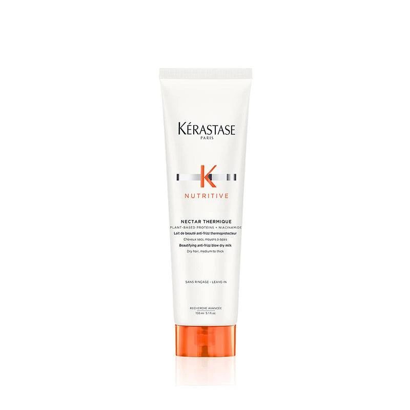 Le Nectar Thermique de Kérastase est un produit sans rinçage qui agit comme un lait thermoprotecteur jusqu’à 230°C. Il est spécialement conçu pour nourrir les cheveux très secs, qu’ils soient fins ou épais. Sa formule crémeuse et nacrée enveloppe délicatement les mèches, préservant ainsi la barrière naturelle du cheveu et renforçant sa résistance (+97% de force)*.