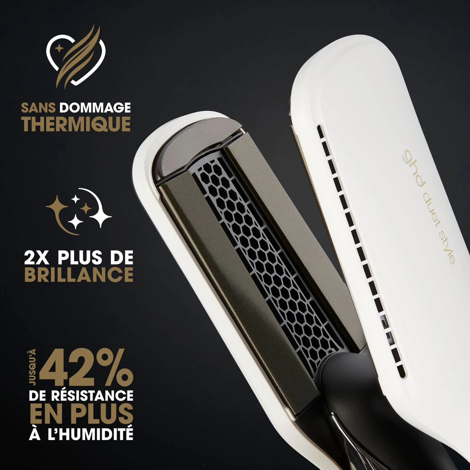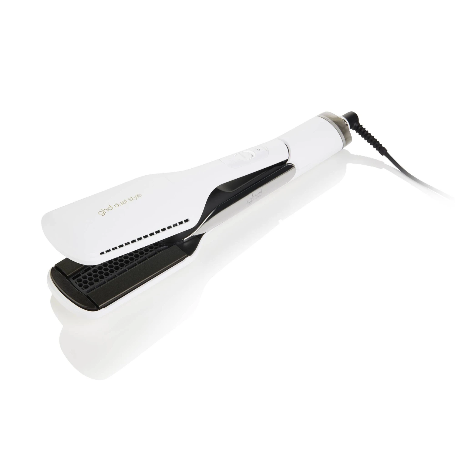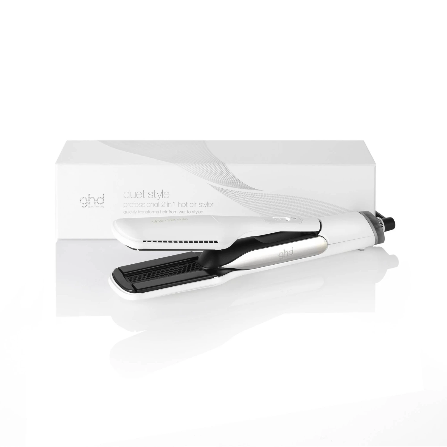 Le Duet Style blanc de ghd est un lisseur séchant 2-en-1*. Il s’agit de LA révolution électro-beauté ! Cet appareil sèche et lisse simultanément les cheveux mouillés sans dommage thermique**.