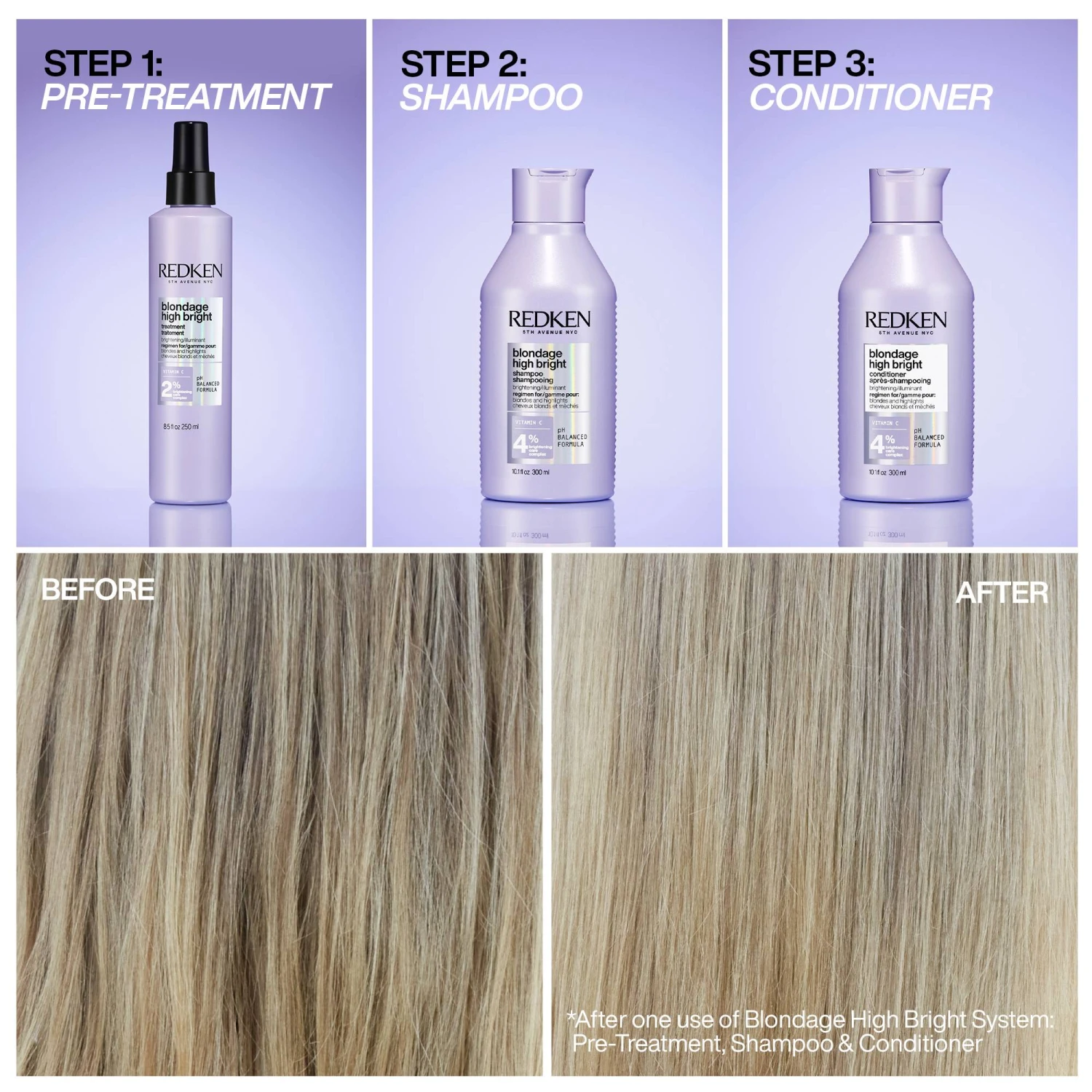 Après avoir lavé vos cheveux avec le shampoing éclat blondage High Bright , appliquez l’après-shampoing sur vos cheveux mouillés.
