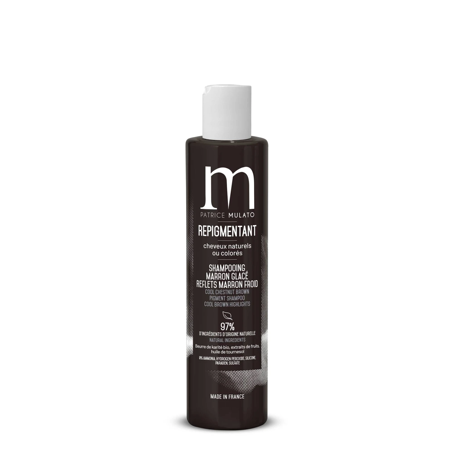 Le shampoing repigmentant Marron glacé apporte des reflets marrons froids aux cheveux naturels ou colorés.