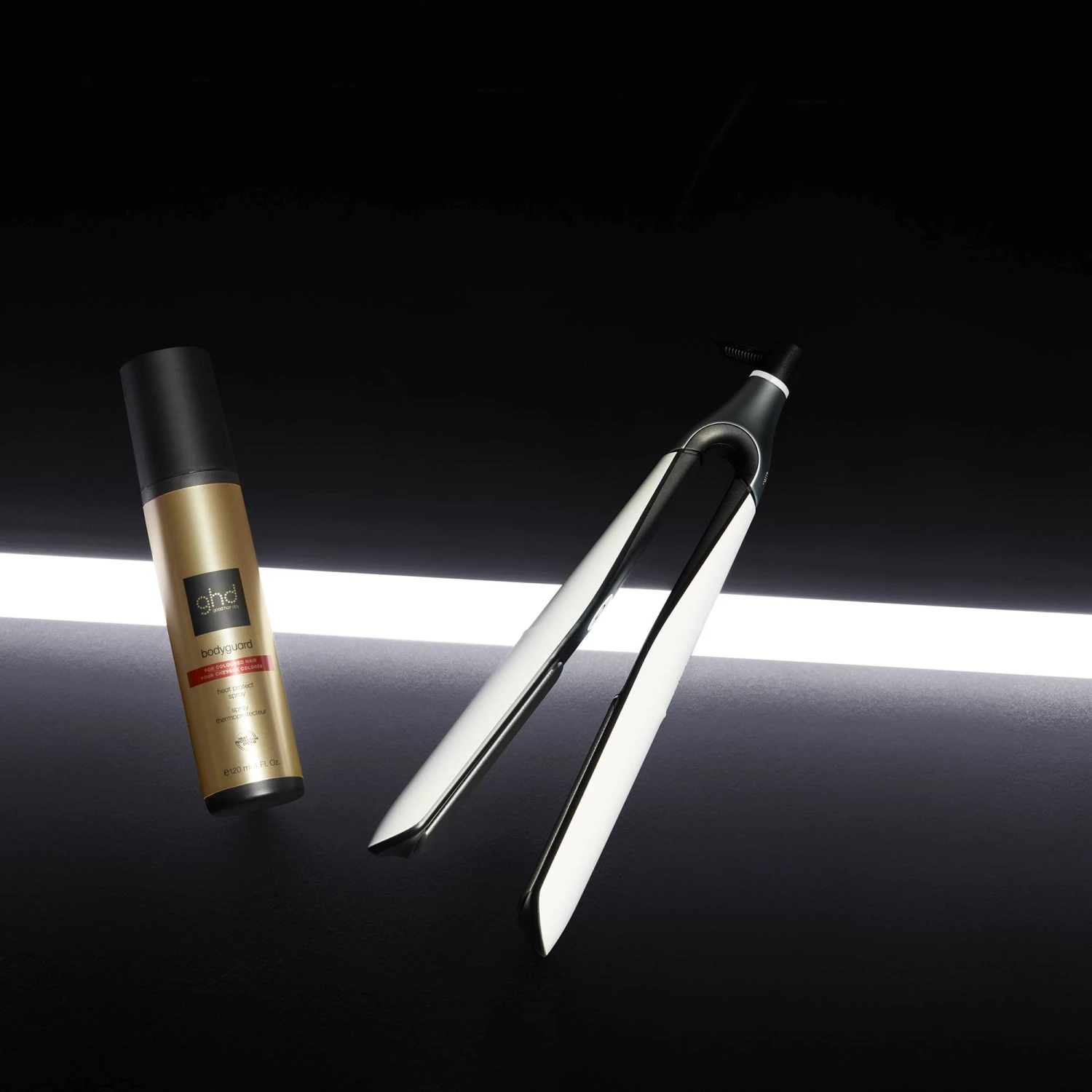 Découvrez le dernier styler® de ghd : Chronos, un lisseur 3x plus rapide* pour des résultats haute définition durant 24h** et en un seul passage, accompagné du spray thermoprotecteur Bodyguard Colour spécial cheveux colorés.