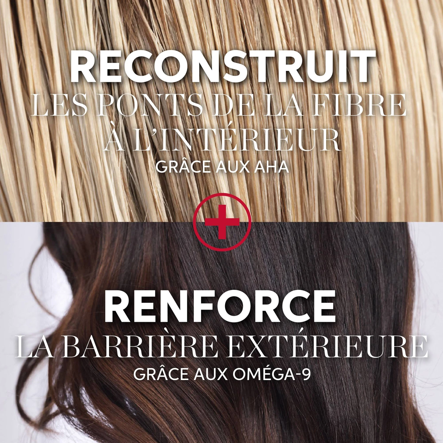 Il est formulé à partir d’acides Alpha-Hydroxylés et d’Oméga-9 qui ont pour actions de reconstruire les ponts de la fibre à l’intérieur et de renforcer la barrière extérieure des cheveux abîmés par différents facteurs comme la chaleur, le brossage et les services techniques.